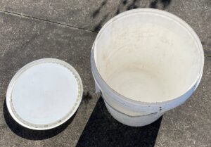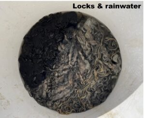 I scrubbed out a bucket with a lid – crucial for creating an anaerobic environment that fosters the growth of beneficial bacteria – added the locks, and covered them with rainwater. Rainwater is essential for SFM because it’s soft water, which allows the suint and lanolin to dissolve more easily. Hard water, on the other hand, contains mineral deposits that can interfere with the fermentation process and reduce its effectiveness. After placing the bucket in the greenhouse, I waited for a week, during which the anaerobic bacteria did their magic. When I lifted the lid, the murky water and film on top indicated that the process was working. Although I expected a strong sulphuric smell, it wasn’t as pungent as I’d anticipated.