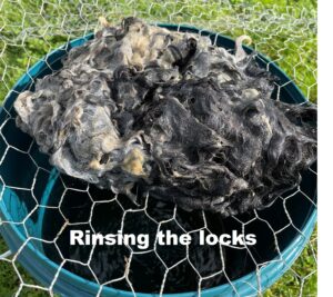 After tipping out the murky water, I rinsed the locks thoroughly, and it didn’t take long for the water to run clear, washing away the grimy film. If I had other fleeces to ferment, I would have saved the murky water as a “starter” culture, which would introduce the established bacteria to the new fleece and accelerate the fermentation process. This technique can reportedly reduce the processing time to just a few days, provided the conditions are optimal.