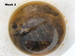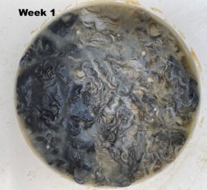 During the second week, the greenhouse temperatures remained warm, providing ideal conditions for the bacteria to continue breaking down the suint and impurities. When I lifted the lid after week two, the smell had become more pronounced, although I suspect it would have been significantly stronger if I had started with a heavily soiled fleece. The water had become even murkier than before, and the film on top had thickened, indicating the ongoing fermentation process.